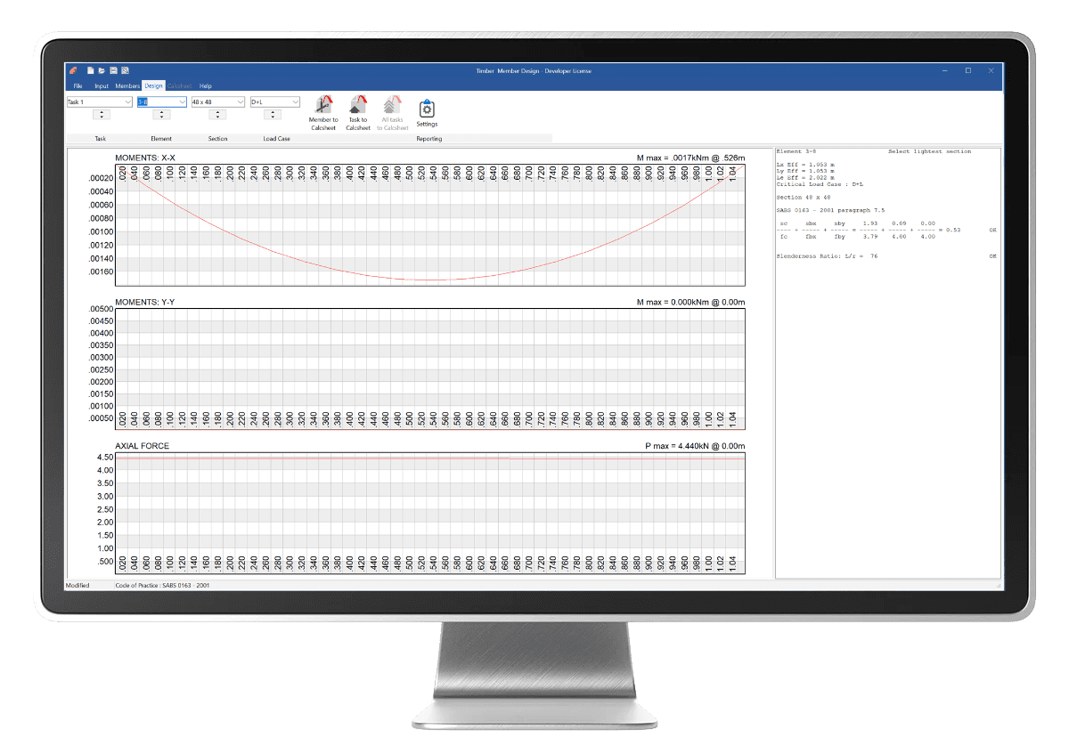Timber Beam checks and optimises timber members subject to axial and bending stresses, e.g., beams, frames, and trusses.